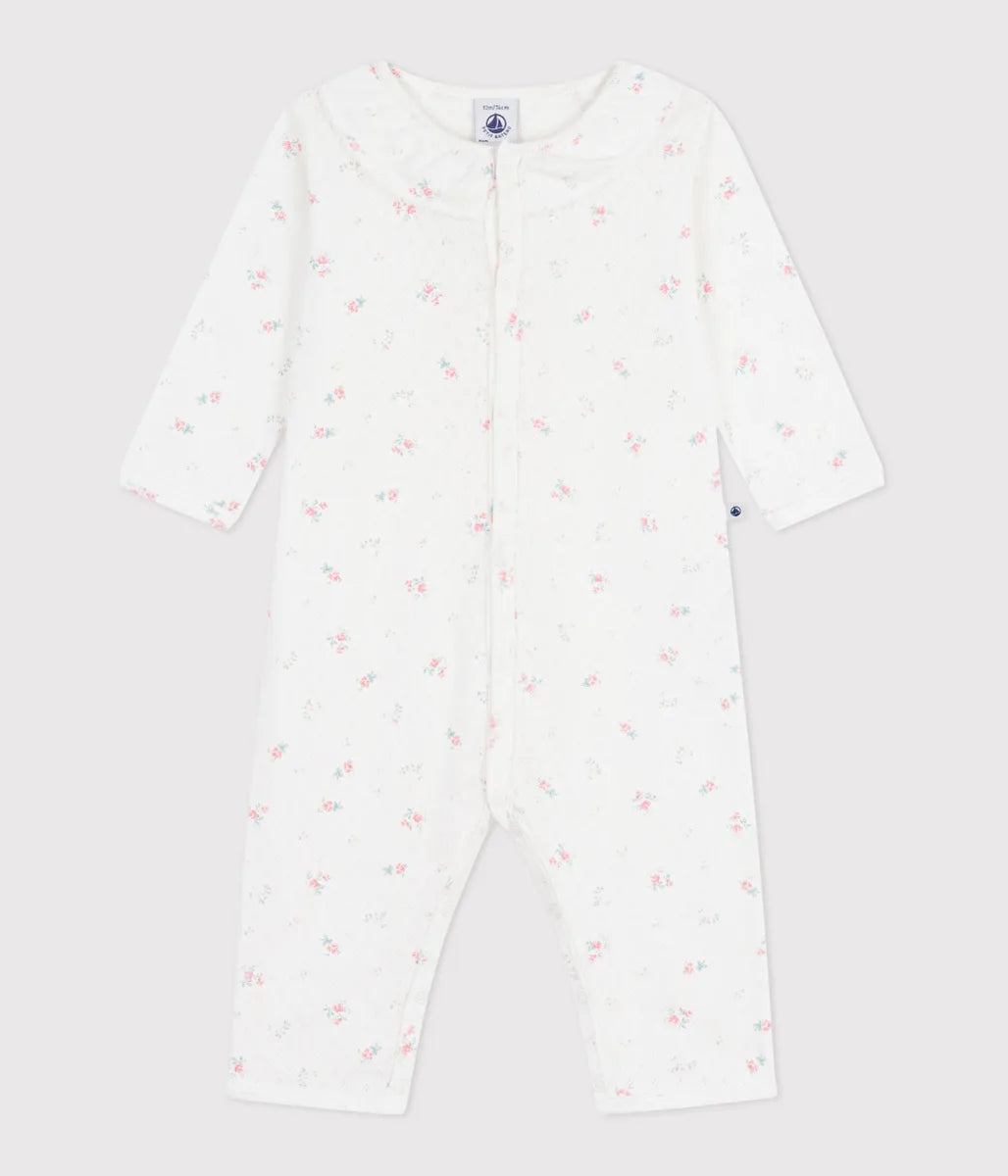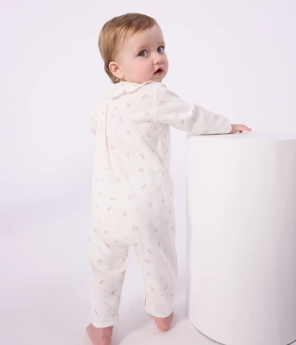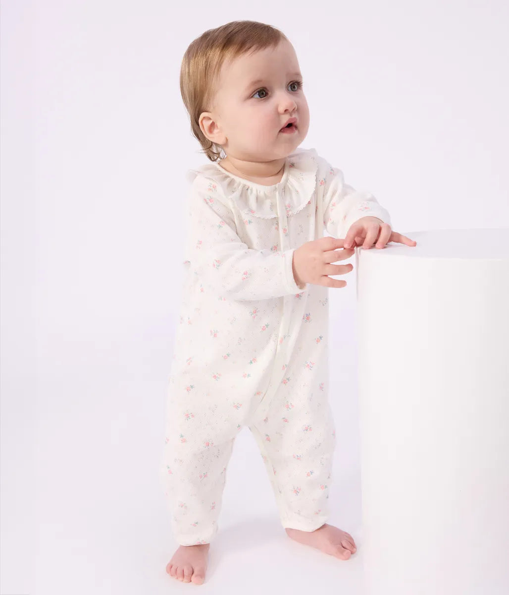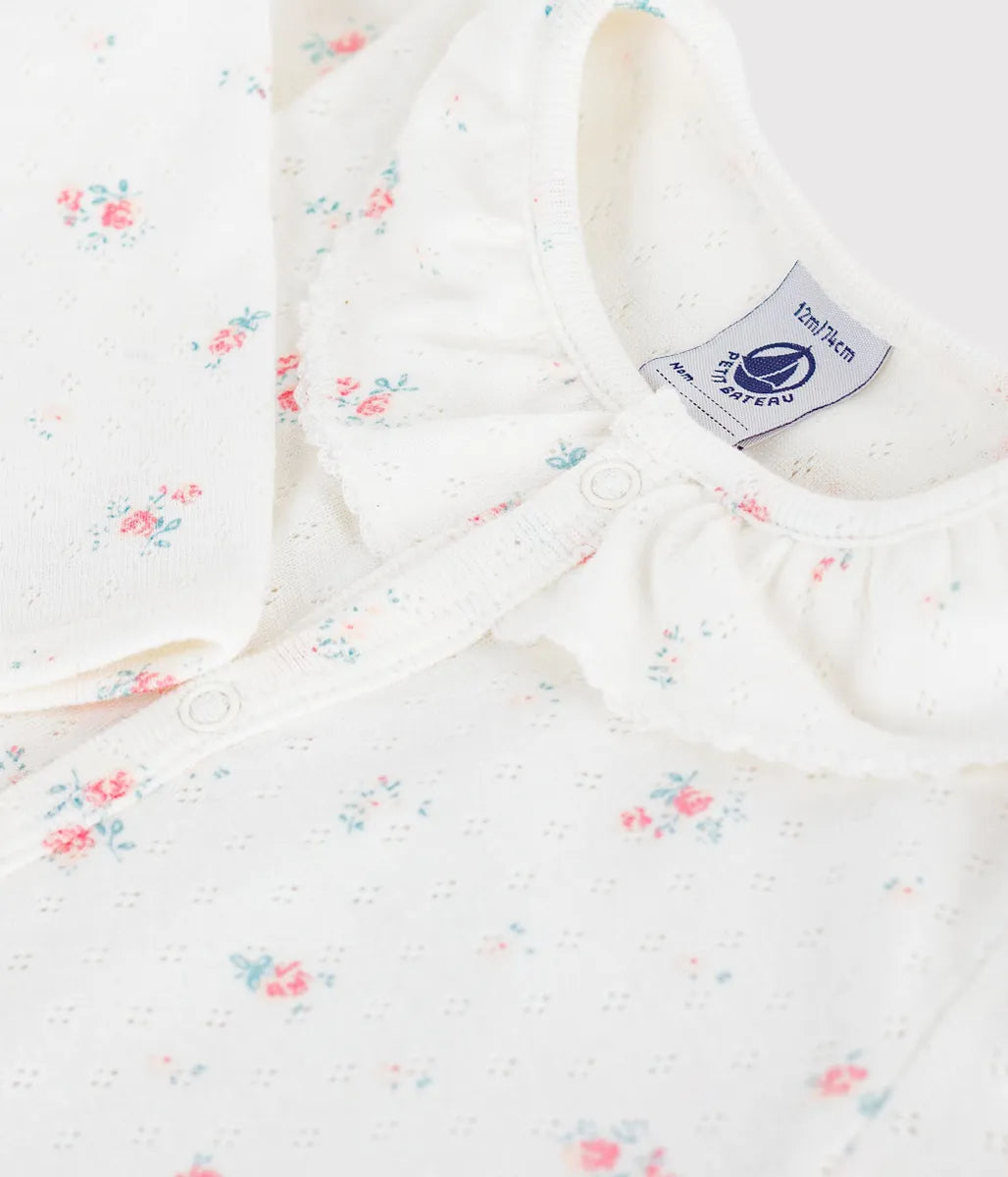 愛らしい小ぶりなフラワープリントをあしらった針抜きロンパースです。ピコレースとフリル衿がデザインにアクセントをプラス。前面が大きく開くので脱ぎ着が楽なうえ、何枚あっても嬉しいアイテムはご自宅用としてはもちろん、出産祝いなどのギフトにも大変喜ばれます。