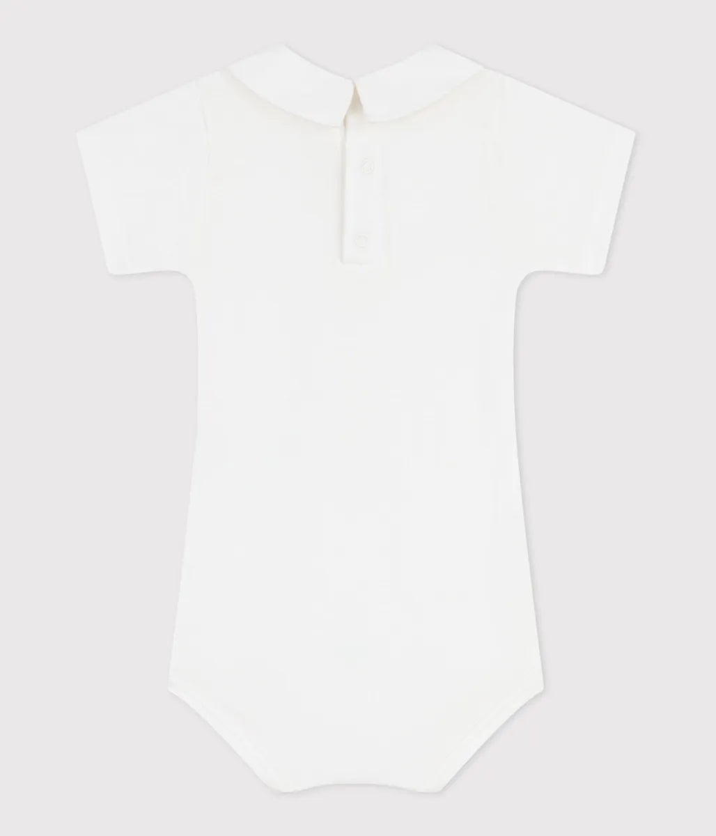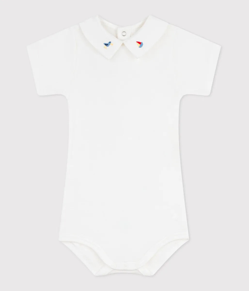 丸衿にあしらったカモメとヨットの刺繍がとってもキュートな半袖ボディです。お着替えがしやすいよう、スナップボタンが施されているので外出時も安心。お手持ちのアイテムと合わせやすく、何枚あっても嬉しいアイテムは、出産祝いなどのギフトにもおすすめです。