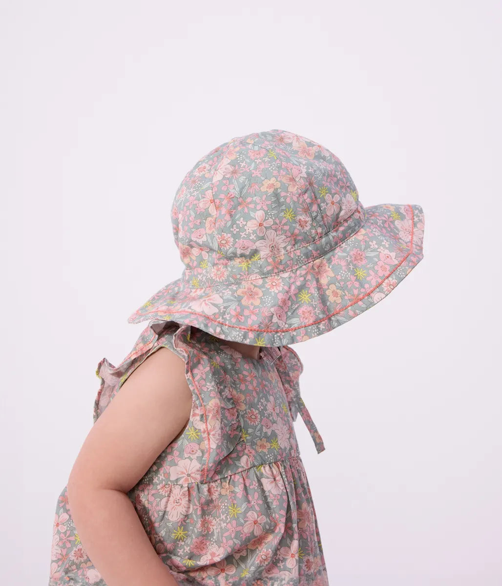日差しが強くなるこれからの季節にベビーの頭をやさしく保護してくれる、環境にやさしいポプリン素材のオンラインブティック限定フラワー柄クロシェです。あご紐付きなので、風の強い日も安心。実用性とかわいさを兼ね備えたアイテムは特別なギフトにもおすすめです。