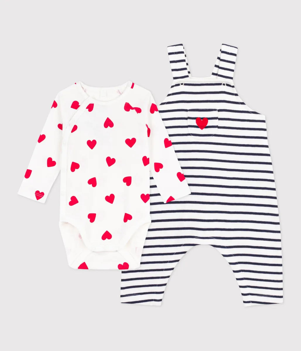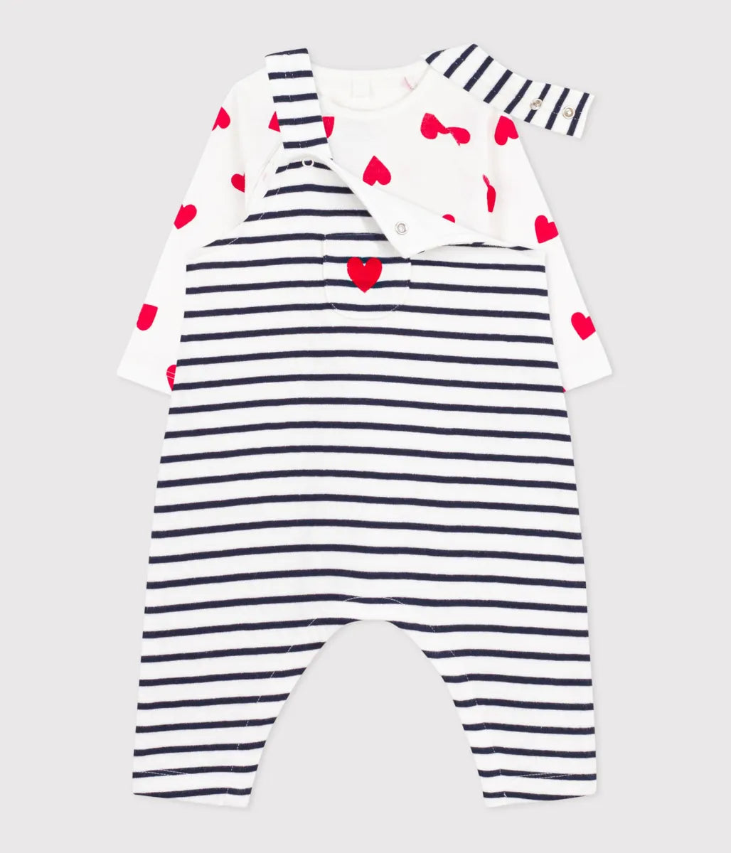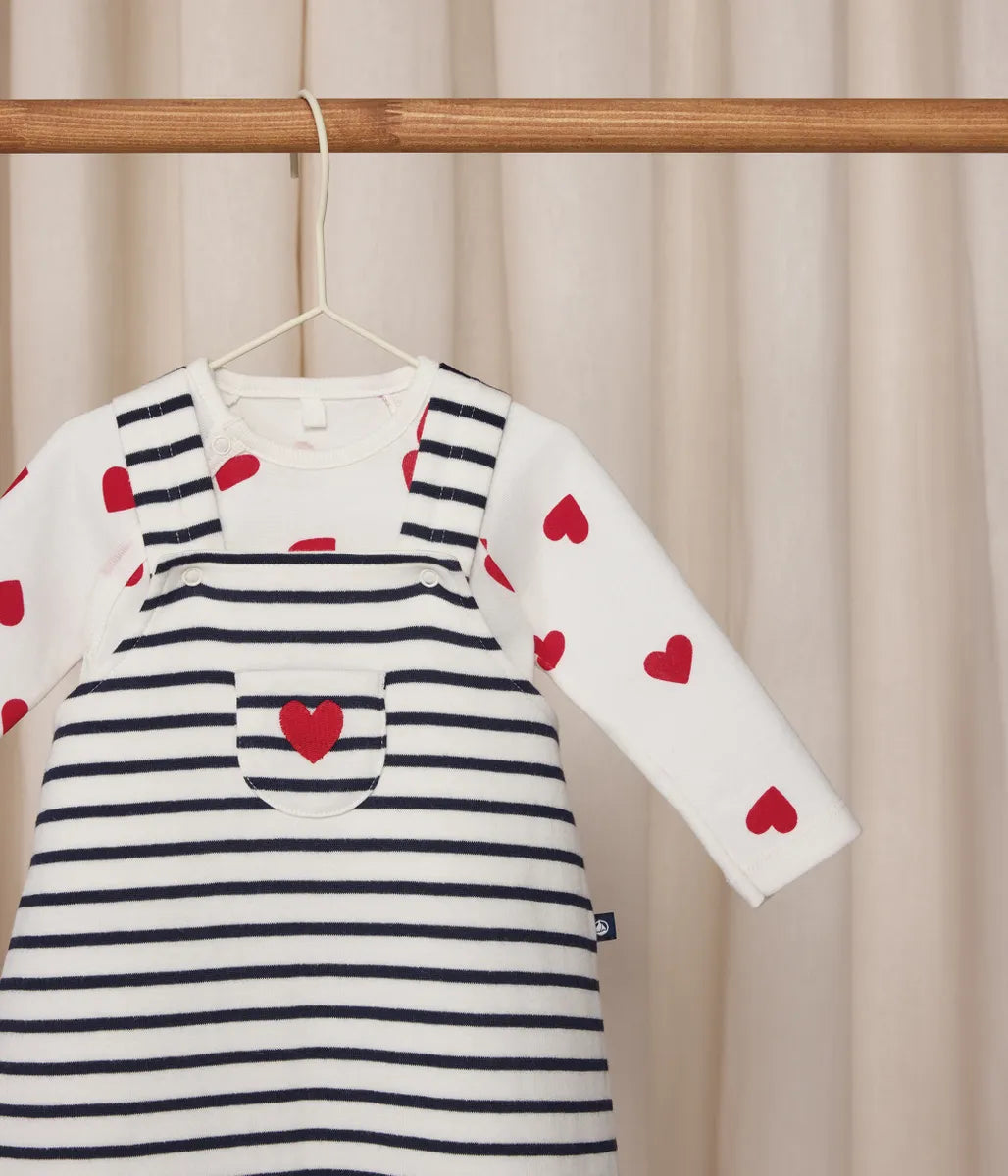 人気のハート柄のボディとアイコニックなマリニエールボーダーをあしらったサロペットを揃えたベビー2点セットです。サロペットの肩紐はボタンで長さ調節が可能。ボディの股下はスナップボタン仕様で、お着替えやおむつ替えが簡単です。ご自宅用としてはもちろん、ご出産祝いなどのギフトにも最適なおすすめセットです。