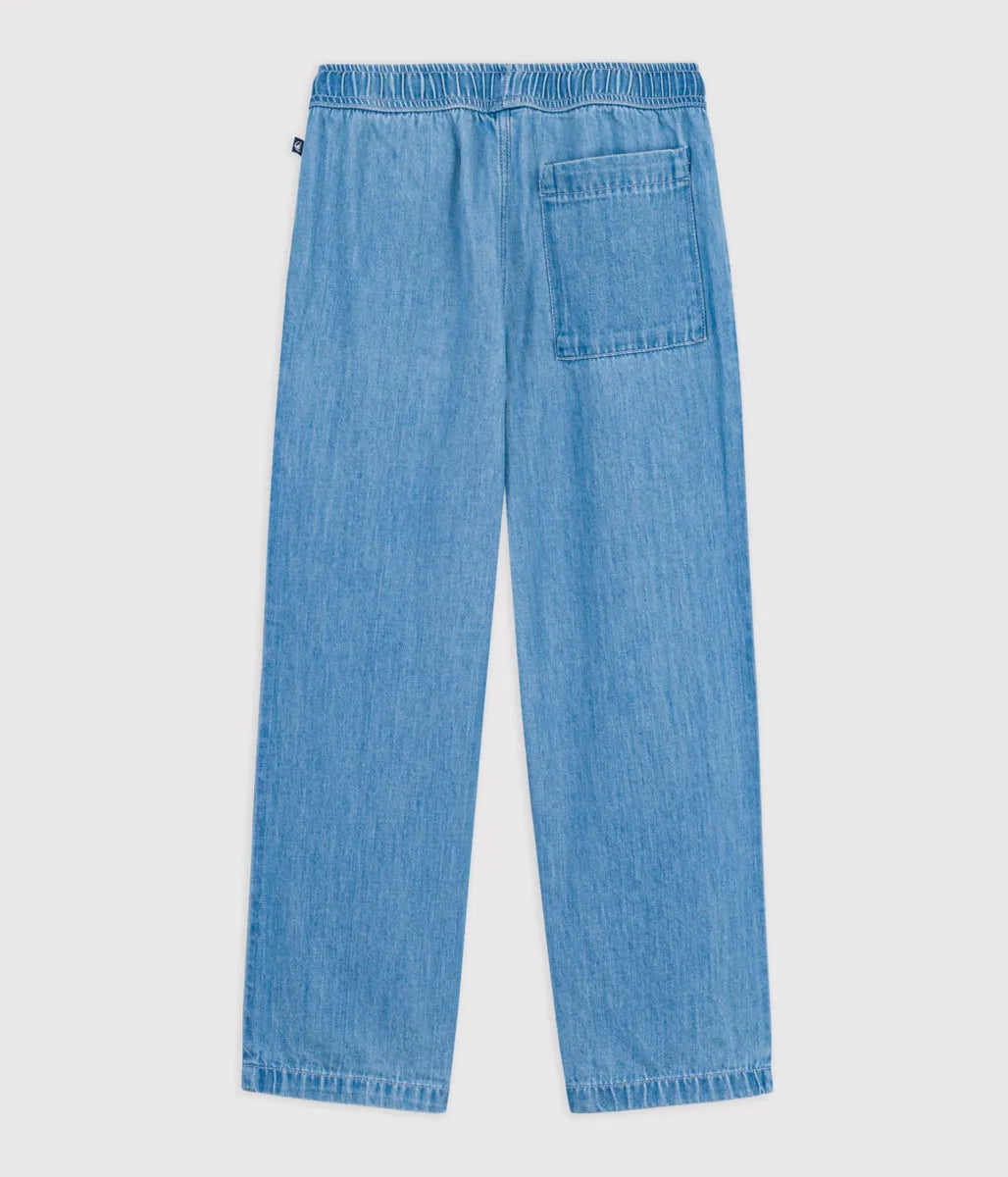 幅広いコーディネートと相性の良いデニムパンツ。爽やかなライトブルーが、これからのシーズンにぴったり。ウエストゴム仕様になっているので脱ぎ着もラクラク。デイリーユースで活躍する万能アイテムとしておすすめです。